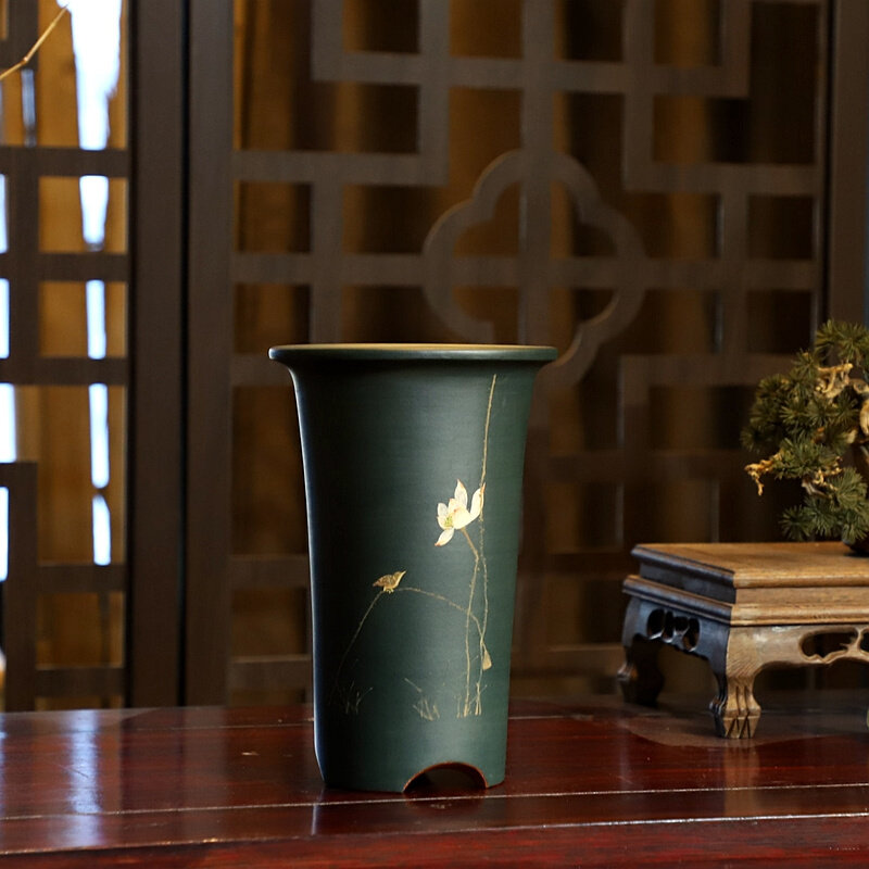 『粉浆泥绘小兰盆』悦涛斋全手工精品兰花盆粉墨绿泥泥绘荷花春兰