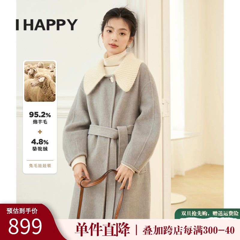 海贝娃娃领驼绒灯笼袖羊毛双面呢外套高级感冬季毛呢大衣呢子外套