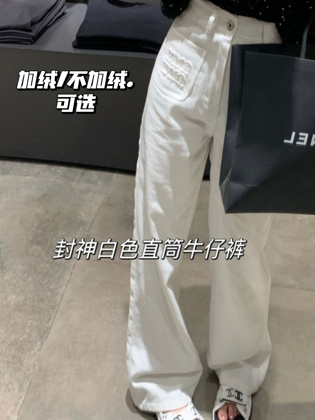 U Nee实拍小香风套装蝴蝶结上衣加绒miu牛仔裤白色直筒阔腿裤拖地