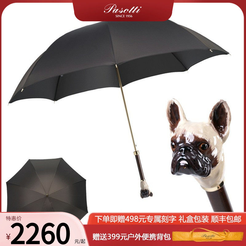 Pasotti意大利晴雨伞棕色法斗犬狗头纯铜珐琅彩绘晴雨两用防晒伞