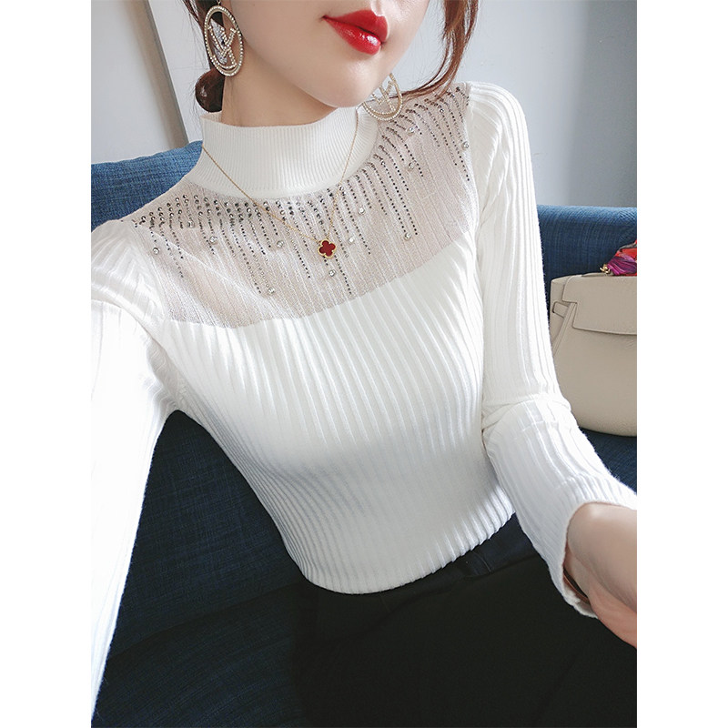 白色针织衫秋装上衣女新款2023年修身显瘦气质烫钻打底衫女士毛衣
