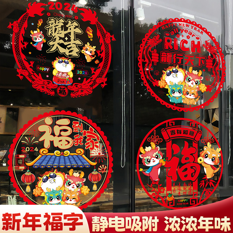 2024春节窗花过年装饰新年布置橱窗玻璃贴纸墙贴龙年静电福字门贴
