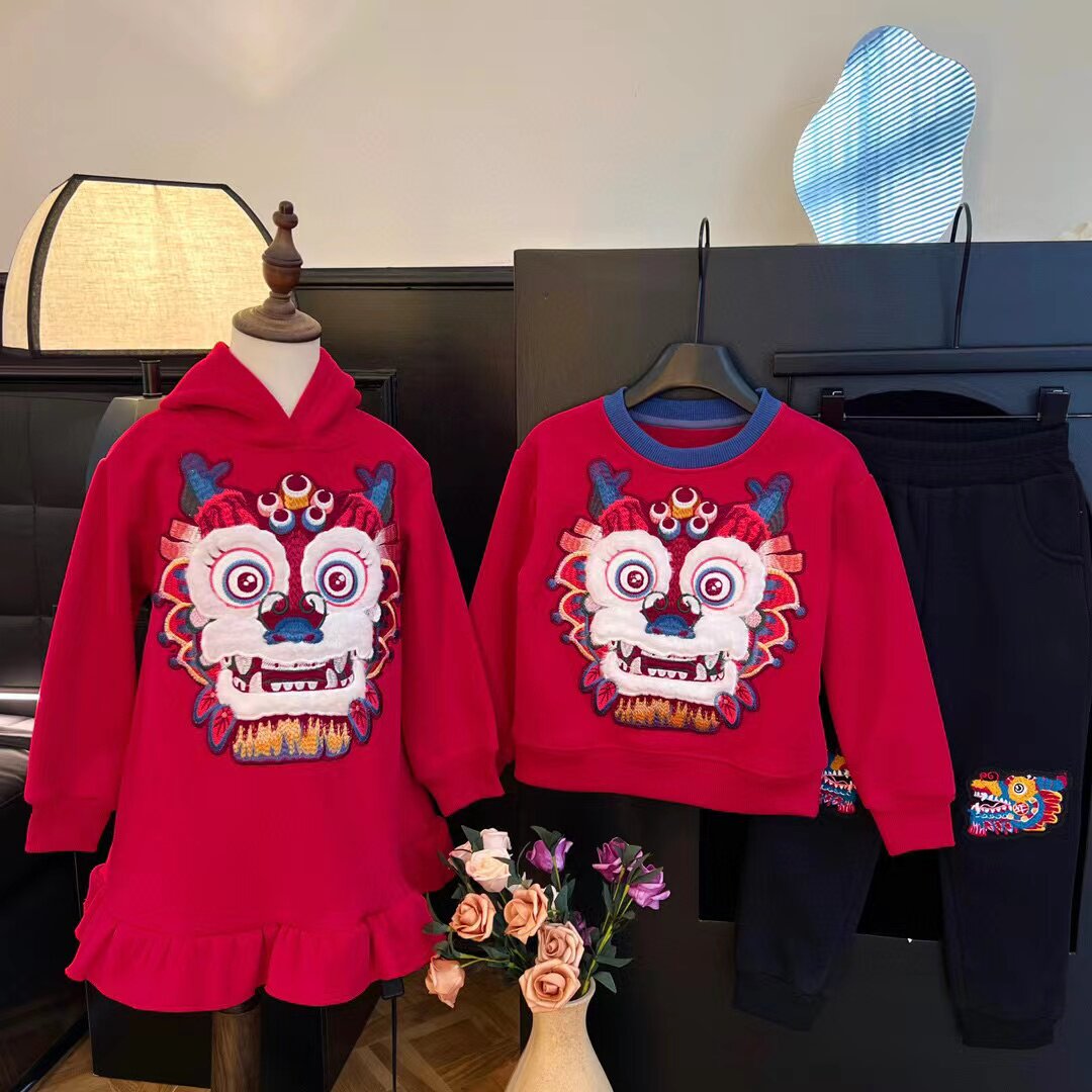 刺绣龙头儿童加绒加厚国风红色新年卫衣套装兄妹装连衣裙拜年服