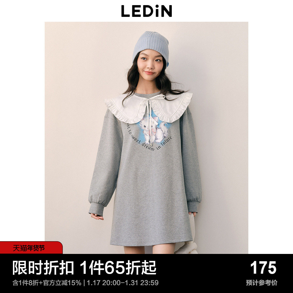 乐町猫咪大翻领卫衣裙23年秋冬新款女装宽松直筒少女运动风连衣裙