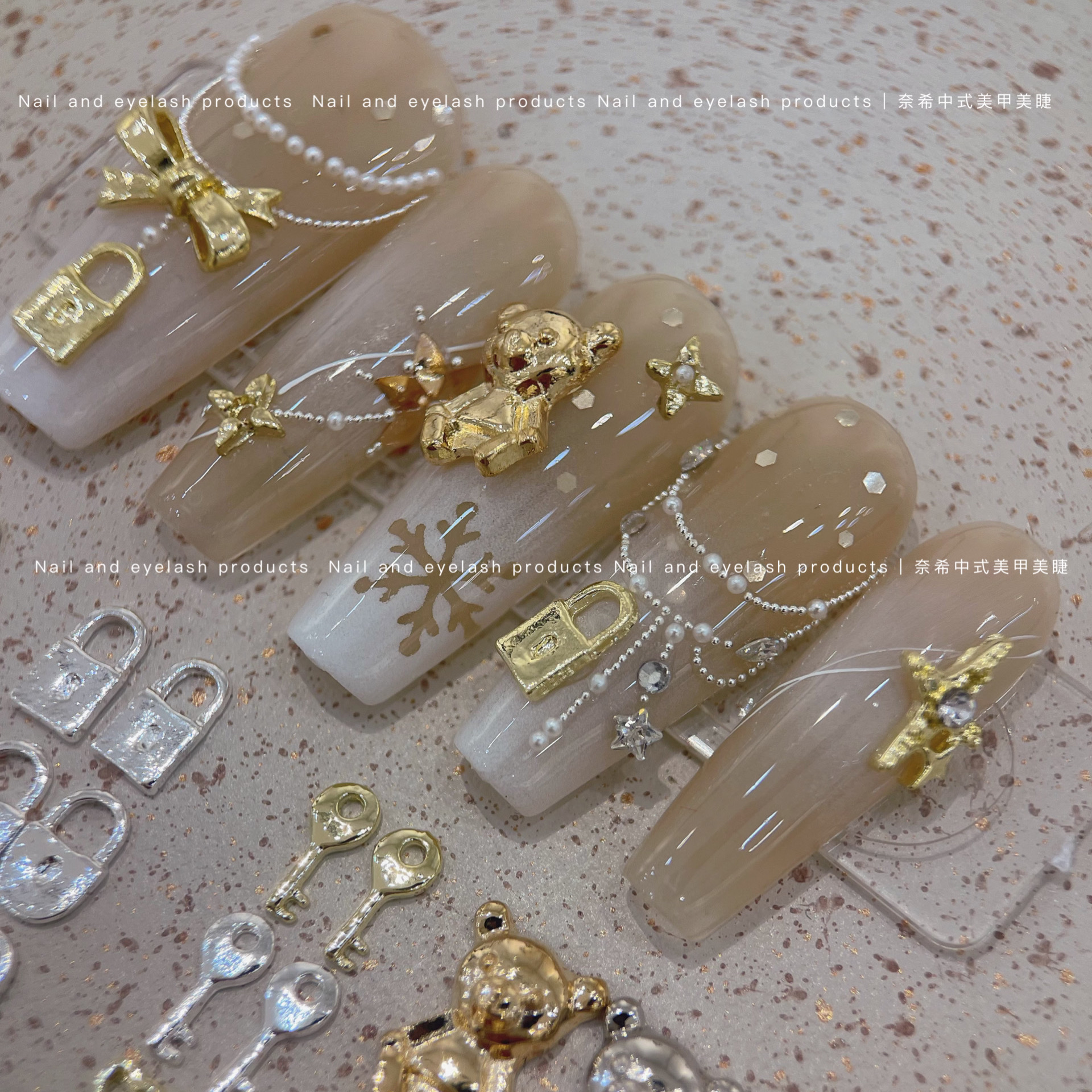 奈希新品富家千金锁扣系列精致美甲金属饰品爱心钥匙拼钻雪花指甲