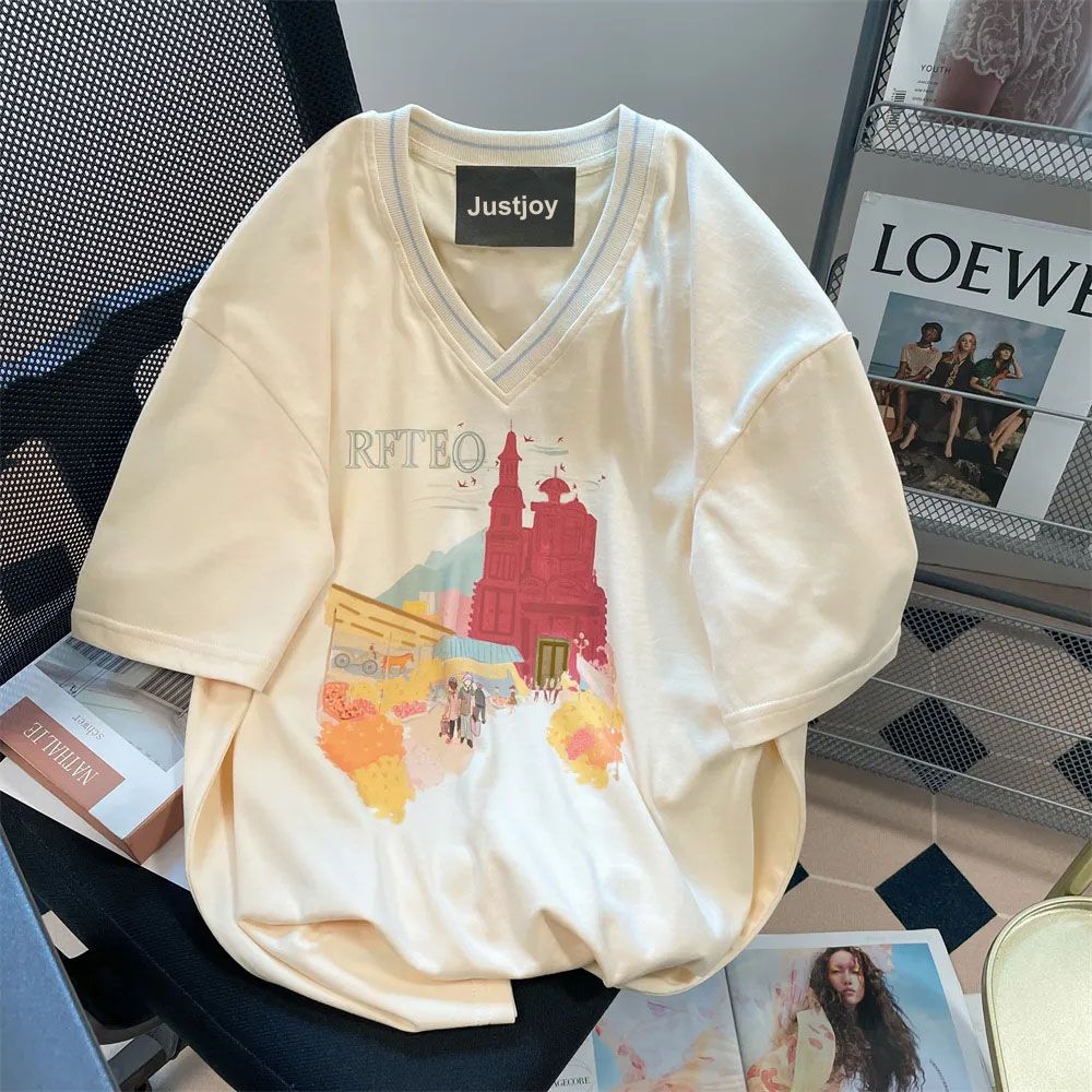 法式复古油画印花v领短袖T恤男女夏季港风大码设计感纯棉情侣上衣