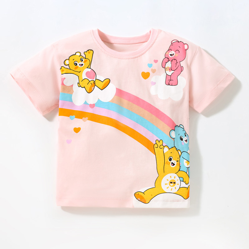 2023新款夏装女童纯棉圆领短袖T恤宝宝粉红色小熊上衣儿童半袖T恤