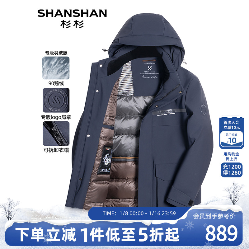 【加厚鹅绒服】SHANSHAN杉杉连帽中长款羽绒服男冬季保暖男士外套