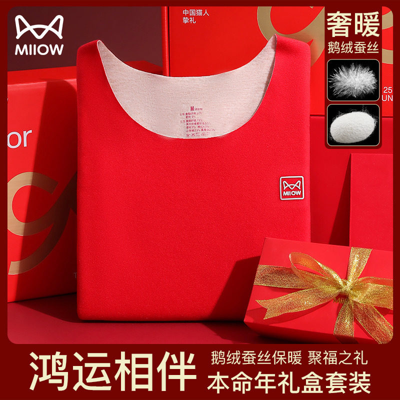 猫人本命年保暖内衣套装女无痕大红色结婚鸿运秋衣裤男2024属龙年