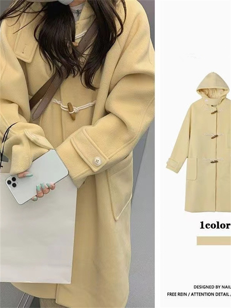 2023新款中长款牛角扣毛呢大衣外套女秋冬季呢子加厚小个子赫本风