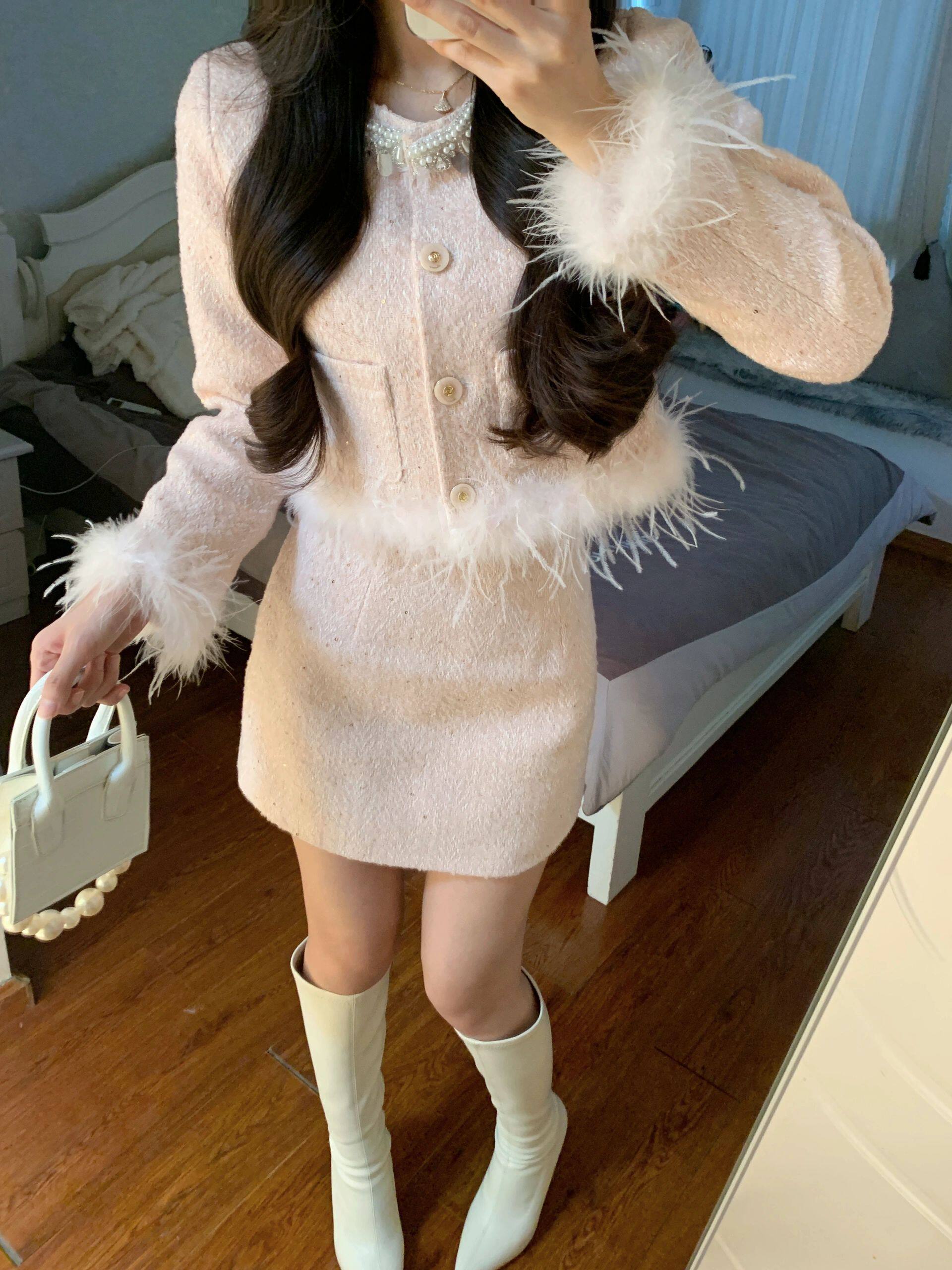 2023秋冬季新款财阀千金穿搭小香风两件套粉色毛边外套半身裙套装