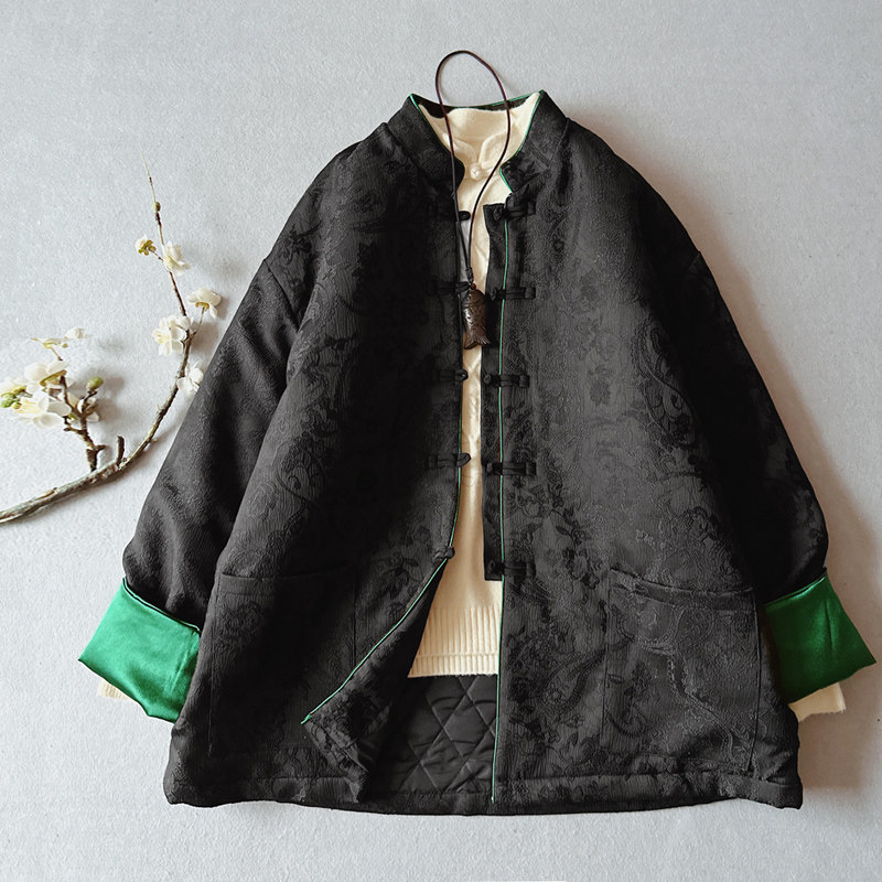 国风新中式精致感缎面提花贵气盘扣撞色翻袖夹棉厚实棉衣外套女冬