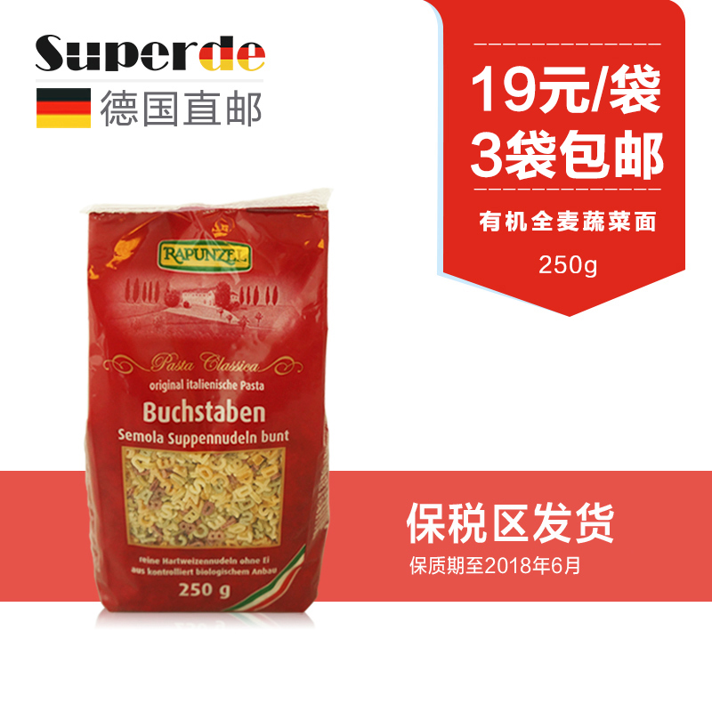 德国长发公主Rapunzel有机宝宝面条 小麦蔬菜汁全麦字母面条 250g