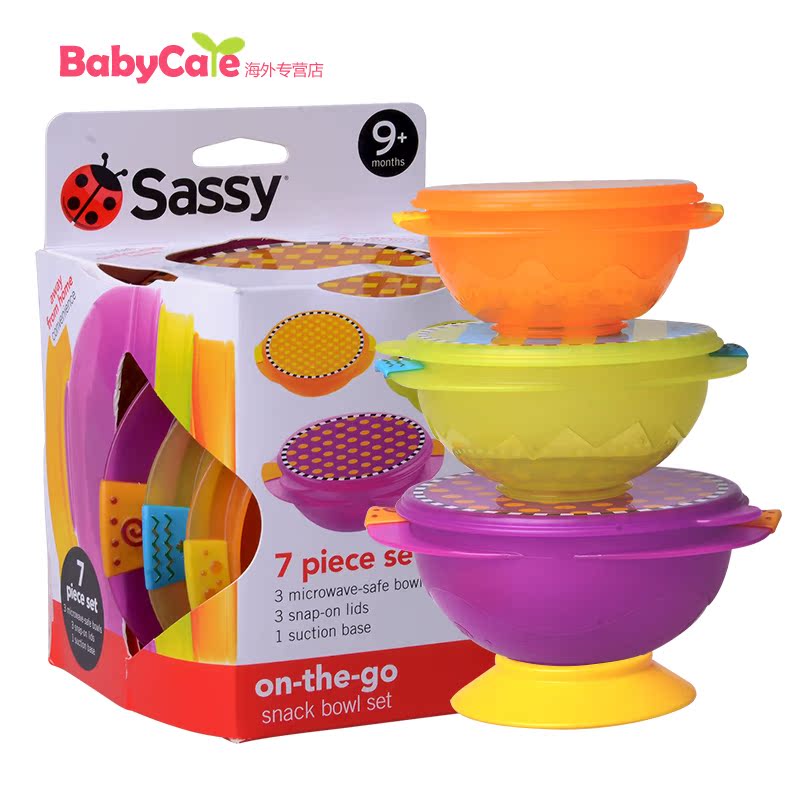 美国进口sassy儿童餐具宝宝吸盘碗套装婴儿碗带盖三件套母婴用品