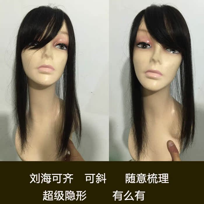 纯手工真发刘海女 隐形无痕假发片 齐斜刘海遮盖头顶白发真发发块