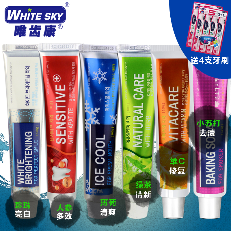 韩国进口唯齿康世延牙膏6支 人参草本苏打健齿洁白清新去渍送牙刷