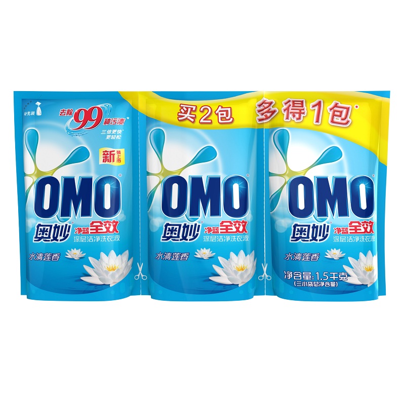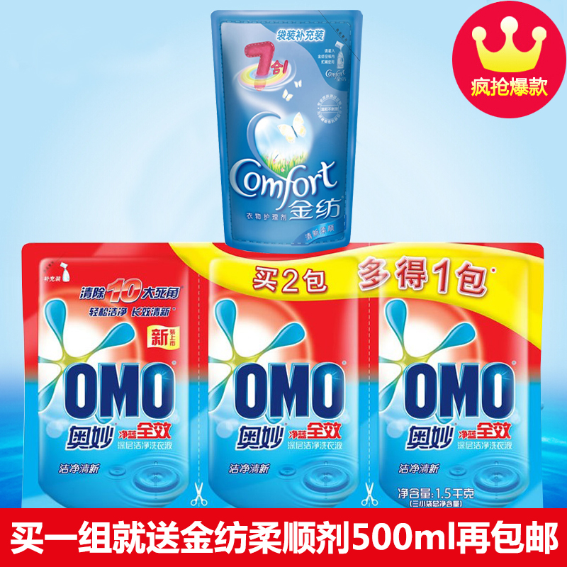 奥妙洗衣液净蓝全效深层洁净洗衣液500g*3袋送衣物柔顺剂 包邮