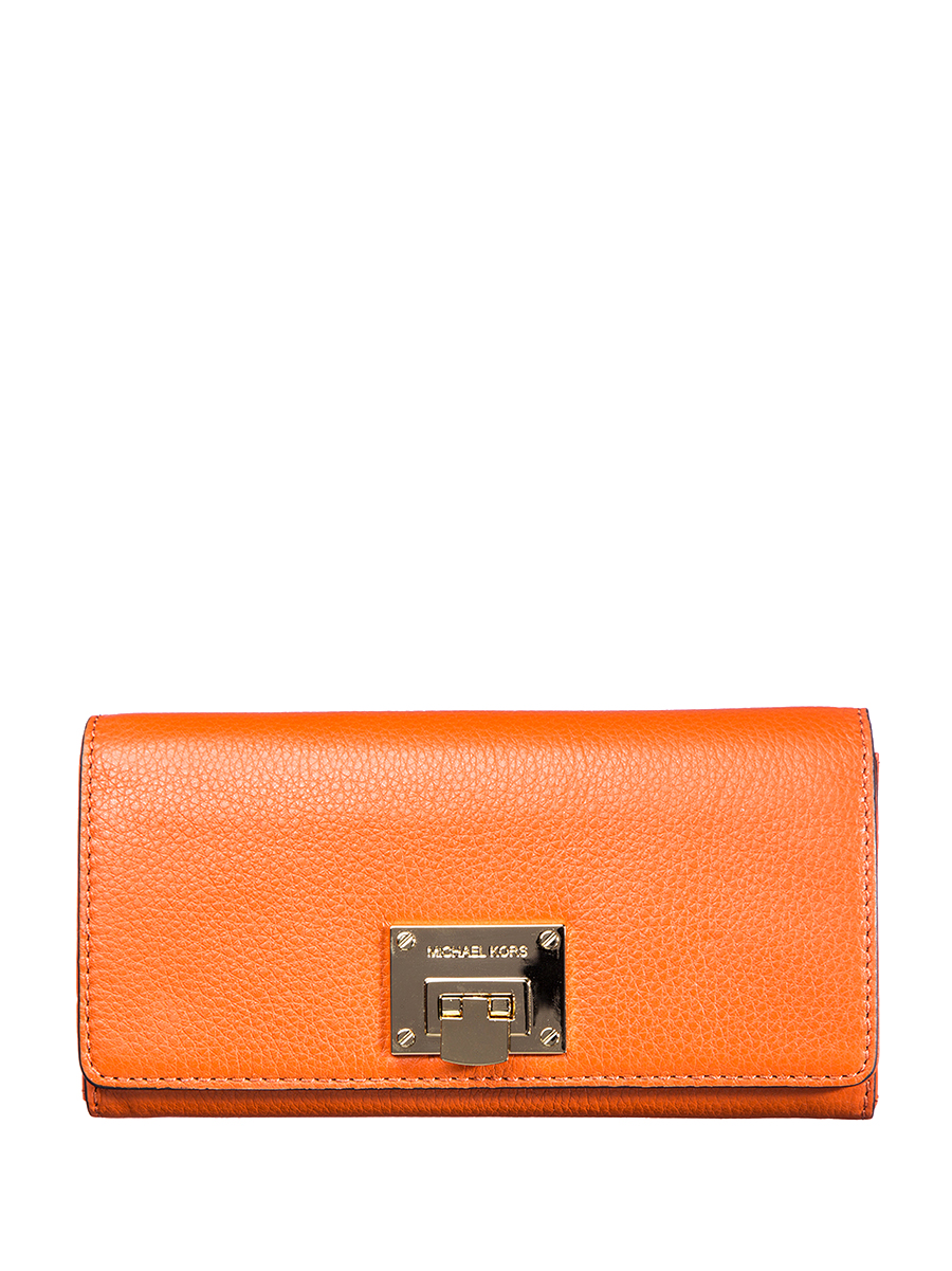 Michael Kors ASTRID系列橙色荔枝纹翻盖锁扣长款钱包