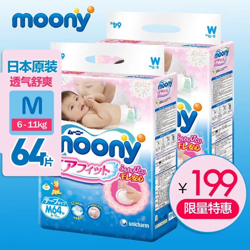 日本原装进口尿不湿尤妮佳Moony婴儿纸尿裤M64片*2男女通用6-11KG