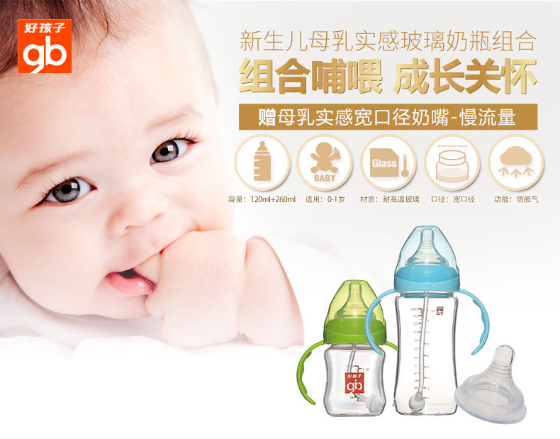 材质:玻璃 品牌:Goodbaby/好孩子 商品条形码:0000000000000 口径大小:宽口径 奶瓶是否带柄:带柄 形状:葫芦型 货号:新生儿玻璃奶瓶组合 容量:120ML+260ML 颜色分类:120ml粉蓝+260ml粉绿.120ml粉绿+260ml粉蓝 查看全文