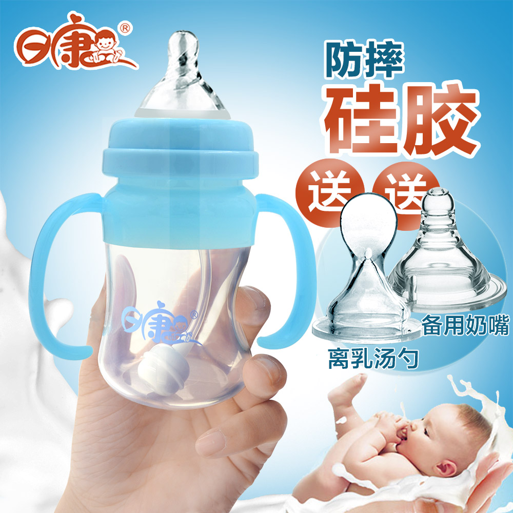 日康全硅胶奶瓶宽口带手柄宝宝奶瓶防摔防胀气婴儿两用奶瓶送软勺