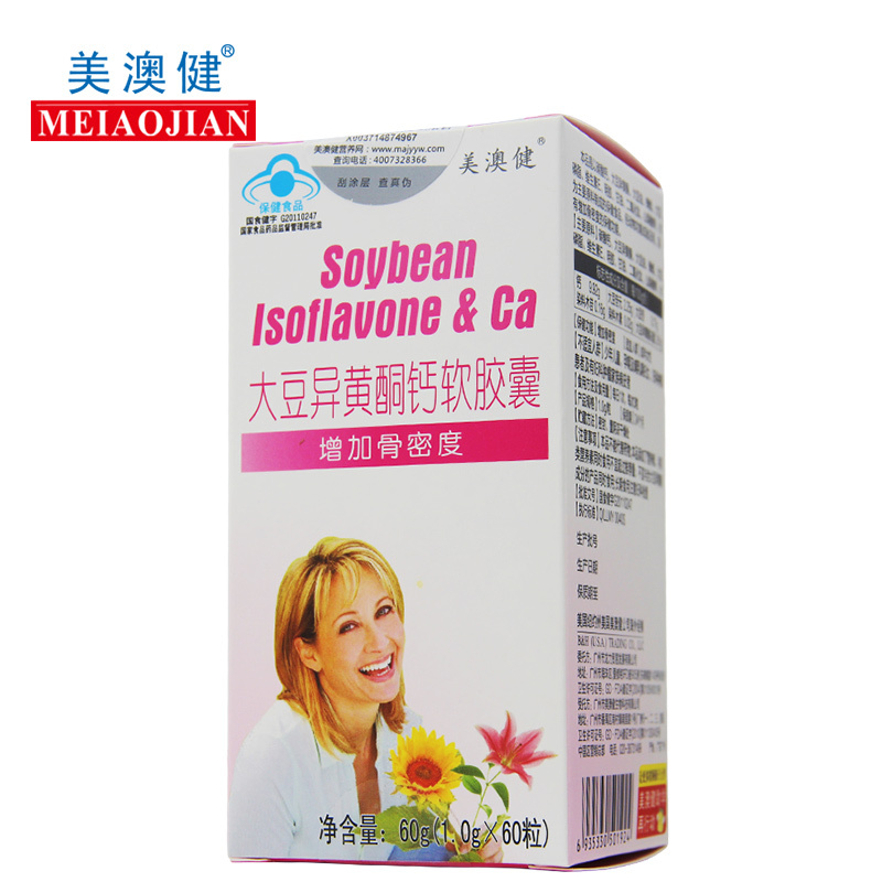 不适宜人群:儿童/青少年.孕期及哺乳期妇女 是否礼盒装:否 是否进口:否 保质期:1080 厂名:广州市美澳健生物科技有限公司 厂址:广州市番禹区南村镇南里路1号(厂房6)一、二、三、四层gs 厂家联系方式:4008883818 品牌:美澳健 适宜人群:女性.成人 产品剂型:软胶囊 保健功能:增加骨密度 具体规格:1.0g/粒*60粒 配料表:碳酸钙、大豆异黄酮、大豆油、蜂蜡、大豆磷脂、维生素E、明胶、甘油、二氧化钛、山梨酸钾、水 主要原料:大豆异黄酮.蜂产品.卵磷脂.钙.维生素E 保健食品产品名称:美澳健牌大豆异黄酮钙软胶囊 批准文号:国食健字G20110247 生产日期:2014年10月01日 至 2014年10月09日 查看全文