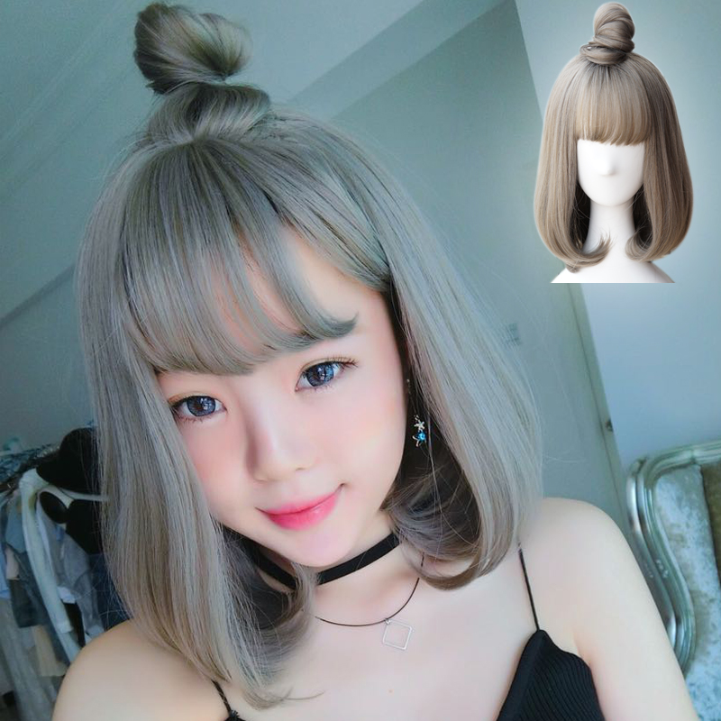 假发女短发大头皮半丸子头假发空气刘海内扣短发奶奶灰青木亚麻灰