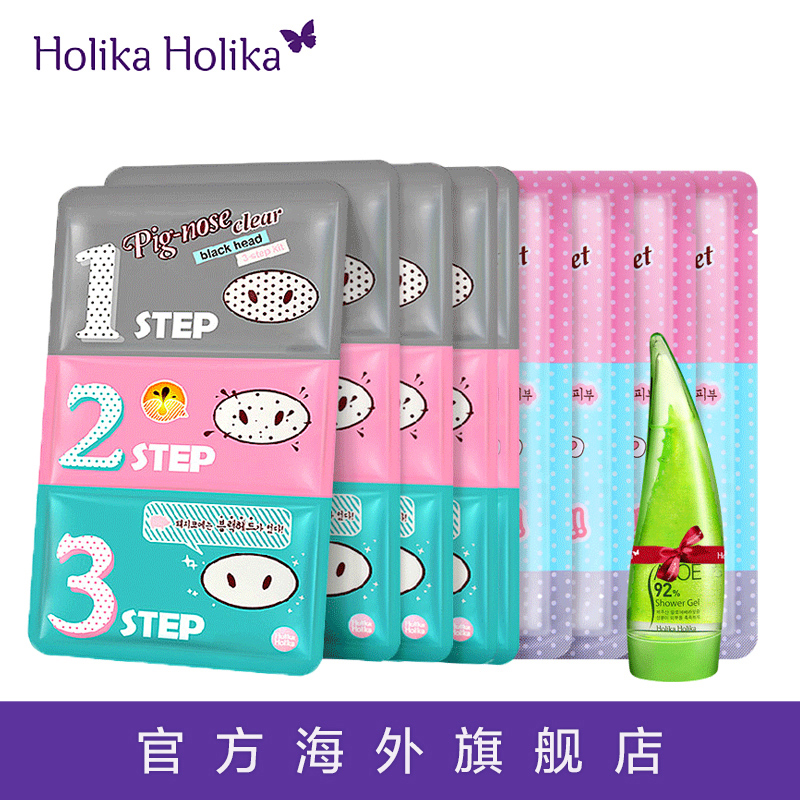 韩国HOLIKA去黑头粉刺猪鼻贴三部曲套装5片+猪皮胶原蛋白面膜4片