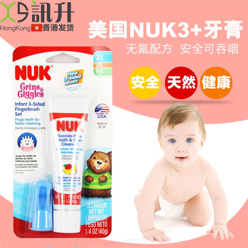 美国NUK3+婴儿牙套牙膏套装宝宝手指牙套可吞咽水果牙膏