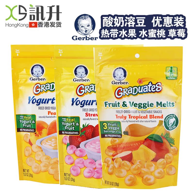 香港直邮嘉宝Gerber酸奶溶溶豆热带水果水蜜桃草莓婴幼儿零食3包