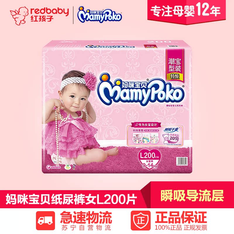 妈咪宝贝瞬吸干爽纸尿裤女宝宝大号L200片【适合9-14kg】