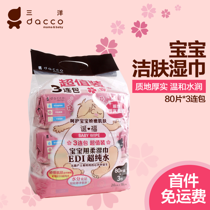 dacco三洋婴儿湿巾 纯水柔湿巾80片装*3连包 宝宝清洁特惠装