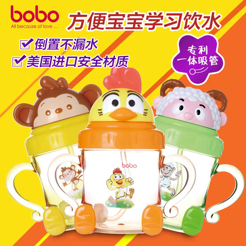bobo乐儿宝儿童卡通吸管杯 婴儿水杯防漏宝宝学饮杯小孩喝水杯子