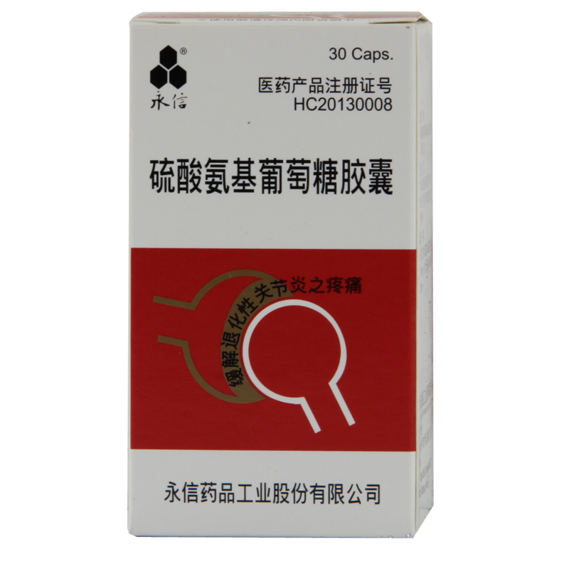 产品剂型:胶囊 药品类别:化学药 用法:口服 适用人群:成人 有效期:36个月 药品分类:处方药 生产企业:永信药品工业股份有限公司 疾病:骨关节炎 使用剂量:建议每次2粒,每日3次 品牌:永信 批准文号:医药产品注册证号HC20130008 症状:关节功能障碍 药品名称:硫酸氨基葡萄糖胶囊 药品规格:30粒*1瓶/盒 药品通用名:硫酸氨基葡萄糖胶囊 查看全文