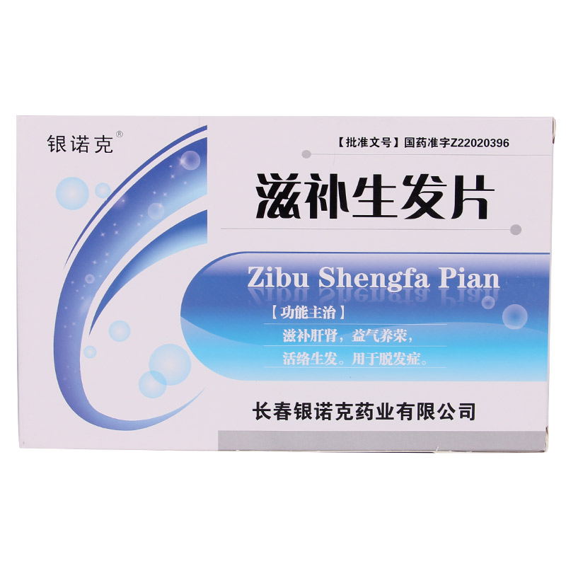产品剂型:片剂 适用人群:不限 用法:口服 药品类别:中药 有效期:36个月 药品分类:处方药 症状:脱发 疾病:脱发 品牌:银诺克 生产企业:长春银诺克药业有限公司 药品名称:滋补生发片 药品通用名:滋补生发片 批准文号:国药准字Z22020396 使用剂量:一次6~8片,一日3次。 药品规格:48片*2小盒/盒 查看全文