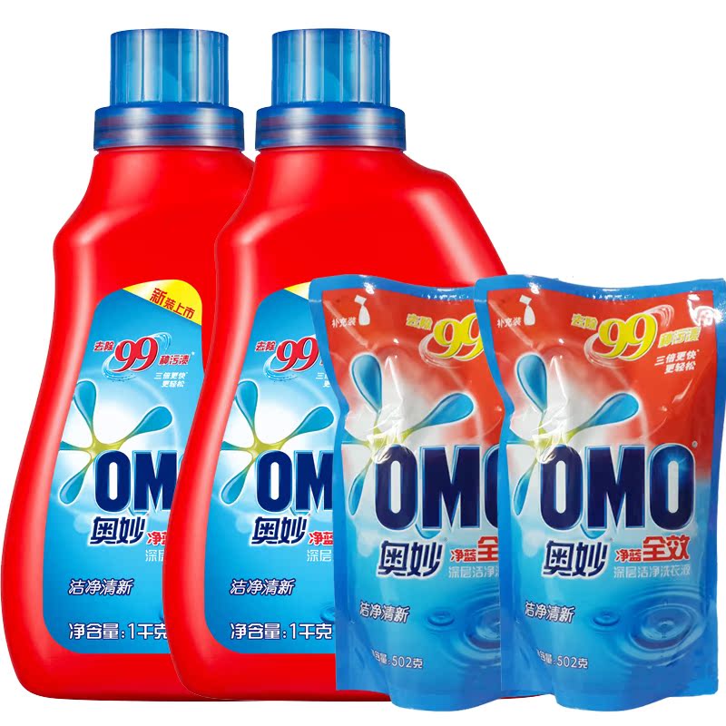 OMO/奥妙洗衣液净蓝全效深层洁净水莲清香洗衣液1KG*2瓶+502g*2袋