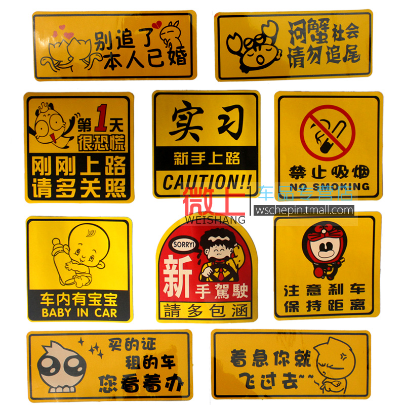 服务内容:支持安装 品牌:ANYCARD/凡卡 材质:胶贴 贴膜类型:车身贴 图案:图腾 图腾种类:其他 型号:WSAY-16C032901 颜色分类:01 新手驾驶 请多包涵.06 注意刹车 保持距离.03 第1天很恐慌.04 禁止吸烟.05 车内有宝宝.02 实习新手上路.07 着急你就飞过去.08 河蟹社会 请勿追尾.09 别追了 本人已婚.10 您看着办 查看全文