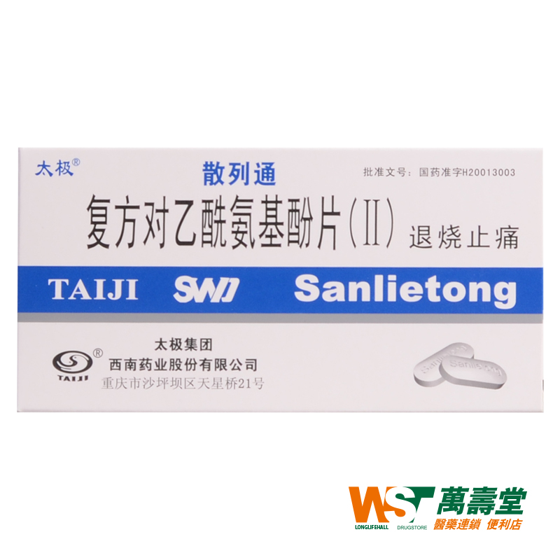 产品剂型:片剂 药品分类:非处方药 套餐类型:标准装 有效期:60个月 用法:口服 类别:复方制剂 品牌:太极 适用人群:儿童.成人 使用剂量:儿童一次0.5~1片;成人一次1~2片,一日3次 疾病:风热感冒.风寒感冒 症状:头痛.肌肉痛.疼痛.发热.牙痛.关节痛.神经痛 药品名称:散列通 复方对乙酰氨基酚片(II) 药品商品名:散列通 药品通用名:复方对乙酰氨基酚片(II) 批准文号:国药准字H20013003 规格:10片/盒 生产企业:西南药业股份有限公司 查看全文