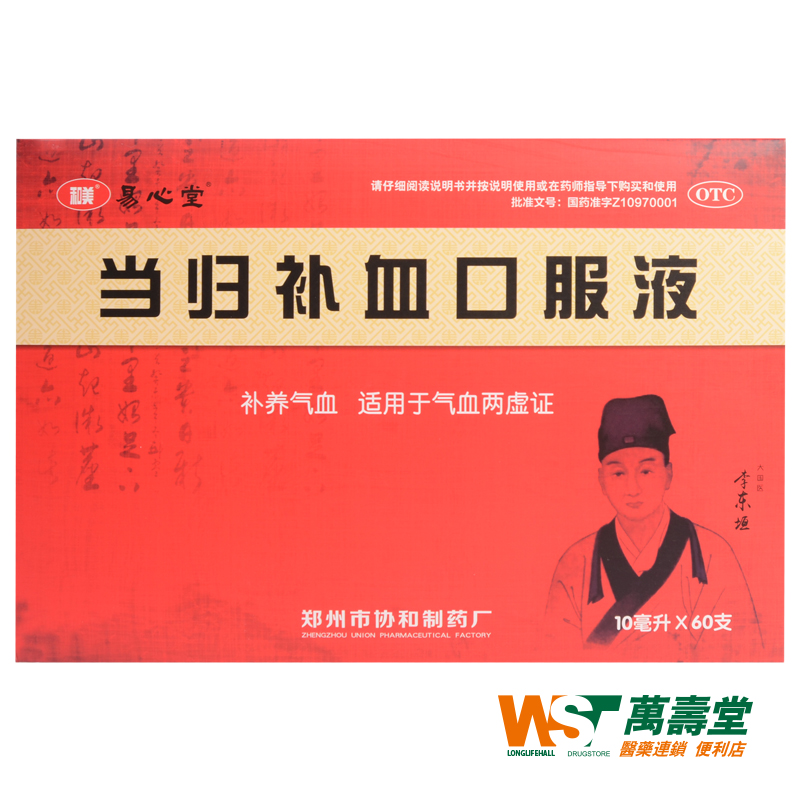 适用人群:不限 有效期:24个月 药品分类:非处方药 套餐类型:标准装 用法:口服 产品剂型:口服液 类别:中药 疾病:气血两虚 症状:血气不足 生产企业:郑州市协和制药厂 使用剂量:一日10毫升,一日2次 药品名称:当归补血口服液 药品通用名:当归补血口服液 批准文号:国药准字Z10970001 品牌:易心堂 规格:10ml*60支/盒 查看全文