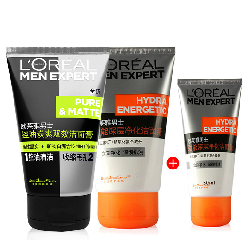 欧莱雅男士洗面奶炭爽双效+劲能深层净化洁面膏控油清洁组合套装