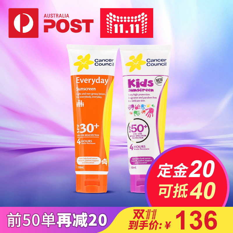 化妆品保质期:36个月 限期使用日期范围:2018-10-01至2018-10-31 规格类型:正常规格 化妆品净含量:110g/ml 品牌:Cancer Council 面部防晒单品:儿童呵护防晒乳SPF50+和日常透薄防晒乳SPF30+套装 产地:澳大利亚 是否为特殊用途化妆品:否 功效:保湿补水 滋润 防晒 隔离 查看全文