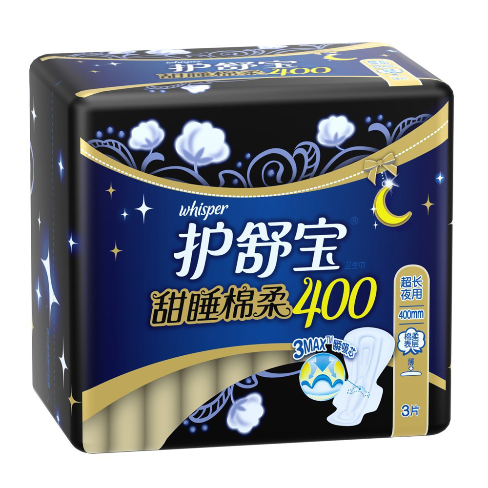 护舒宝超长夜用棉面卫生巾甜睡棉柔400mm3片姨妈巾防漏正品