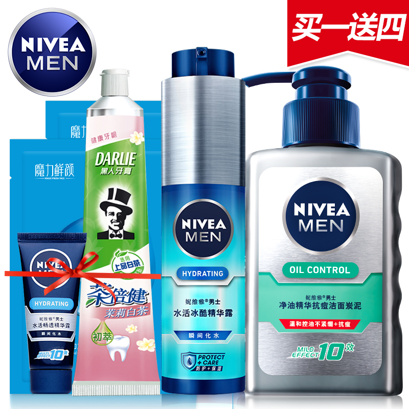 Nivea/妮维雅男士套装水活冰酷精华露补水保湿洗面奶小蓝管