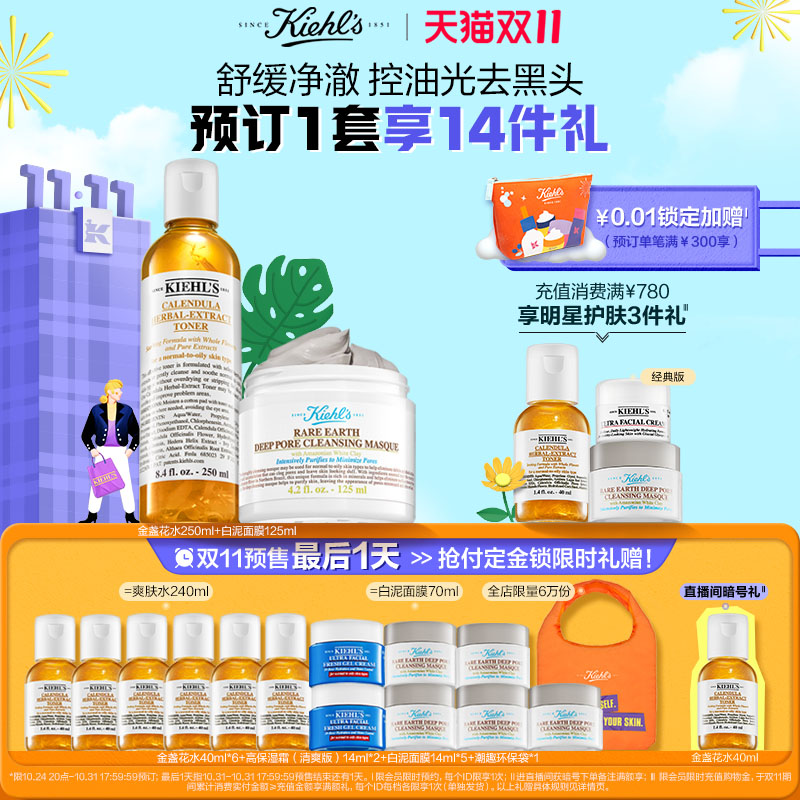 【双11预售】Kiehls科颜氏白泥面膜金盏花爽肤水套装男士