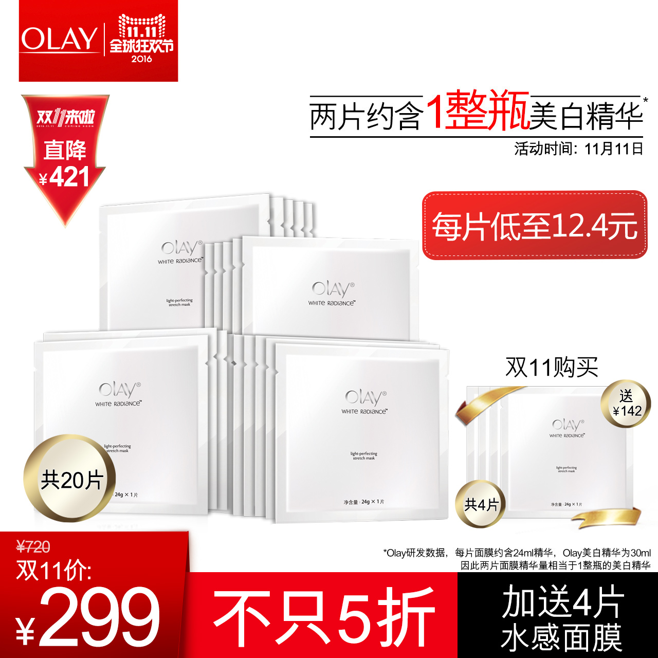 [送4片]olay玉兰油水感透白面膜20片 美白淡斑补水保湿面膜贴女