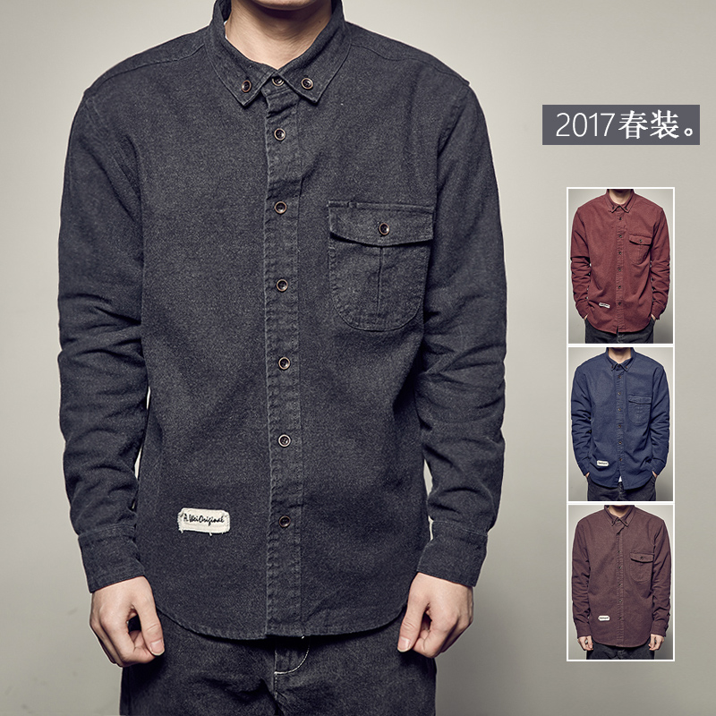 男道2017春季新款外套复古水洗长袖衬衫男青少年加厚纯色休闲衬衣