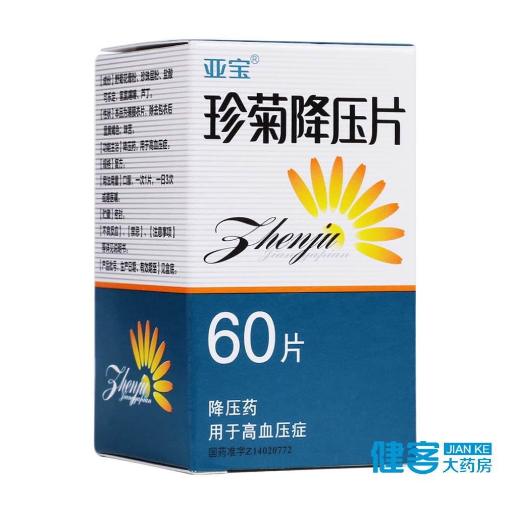 产品剂型:片剂 适用人群:不限 用法:口服 药品类别:中药 药品分类:处方药 疾病:高血压 症状:血压高 有效期:42个月 品牌:亚宝 生产企业:亚宝药业集团股份有限公司 使用剂量:一次1片,一日3次。 药品规格:60片*1瓶/盒 药品名称:珍菊降压片 药品通用名:珍菊降压片 批准文号:国药准字Z14020772 查看全文