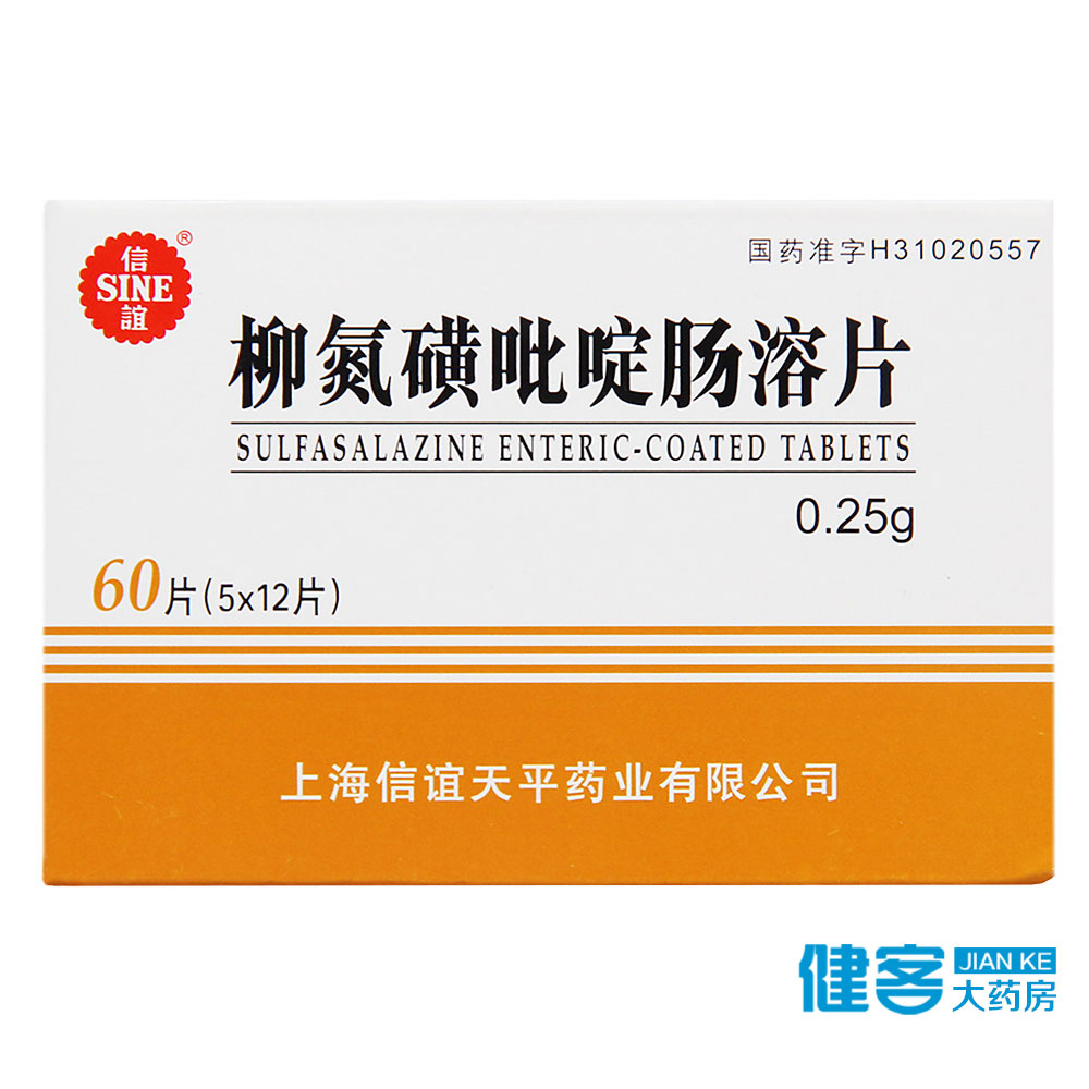 产品剂型:片剂 适用人群:不限 有效期:24个月 药品类别:化学药 用法:口服 药品分类:处方药 症状:风寒湿痹 疾病:风湿关节病 品牌:SINE/信谊 药品规格:0.25g*60片/盒 药品名称:柳氮磺吡啶肠溶片 药品通用名:柳氮磺吡啶肠溶片 使用剂量:每次1g(4片),每天2次。 批准文号:国药准字H31020577 生产企业:国药准字H31020557 查看全文
