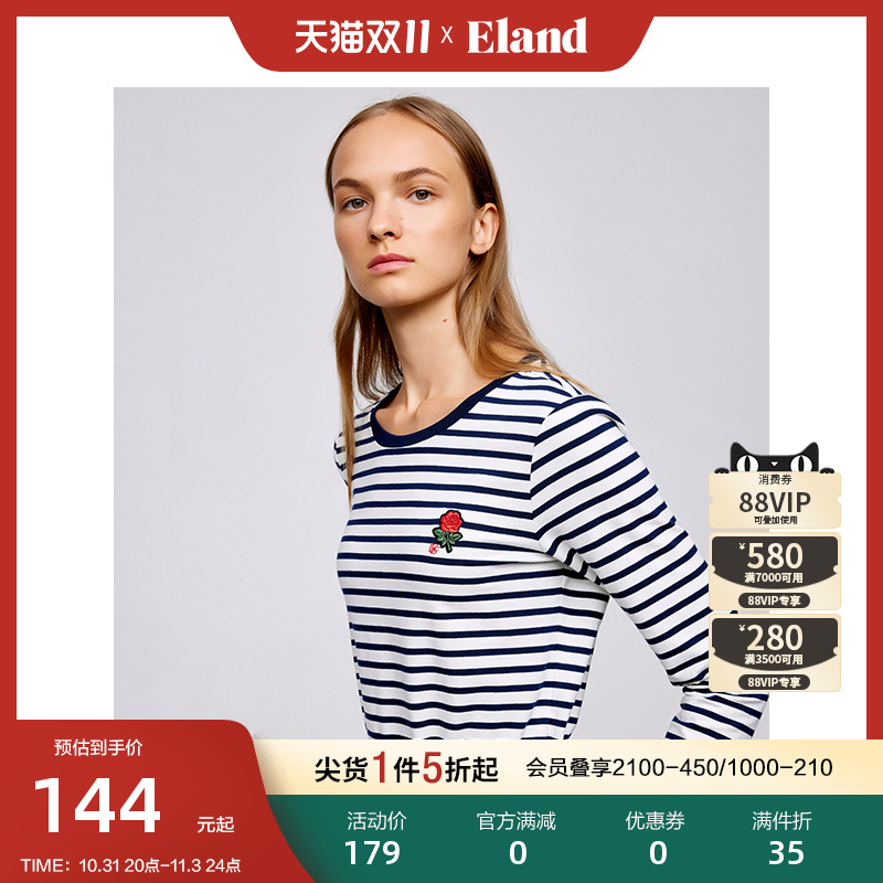 Eland衣恋长袖t恤女秋季长袖T恤女修身条纹学院风针织T恤上衣女