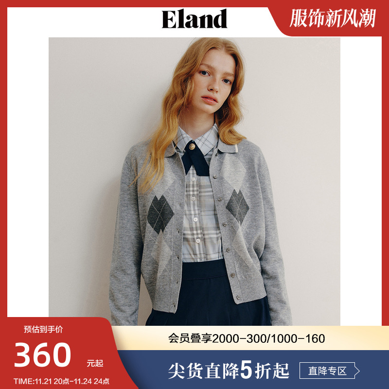 Eland衣恋针织衫女开衫羊毛混纺学院风绞花上衣2023